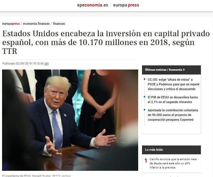 Estados Unidos encabeza la inversión en capital privado español, con más de 10.170 millones en 2018, según TTR