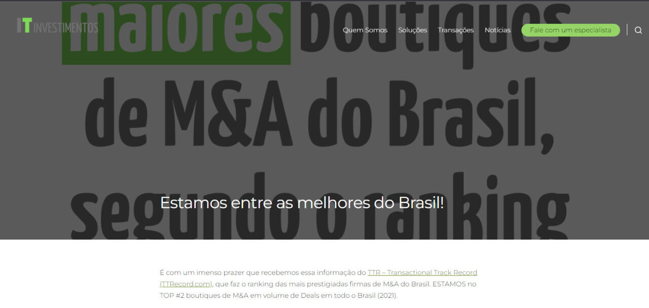 É com um imenso prazer que recebemos essa informação do TTR – Transactional Track Record (TTRecord.com), que faz o ranking das mais prestigiadas firmas de M&A do Brasil. ESTAMOS no TOP #2 boutiques de M&A em volume de Deals em todo o Brasil (2021).