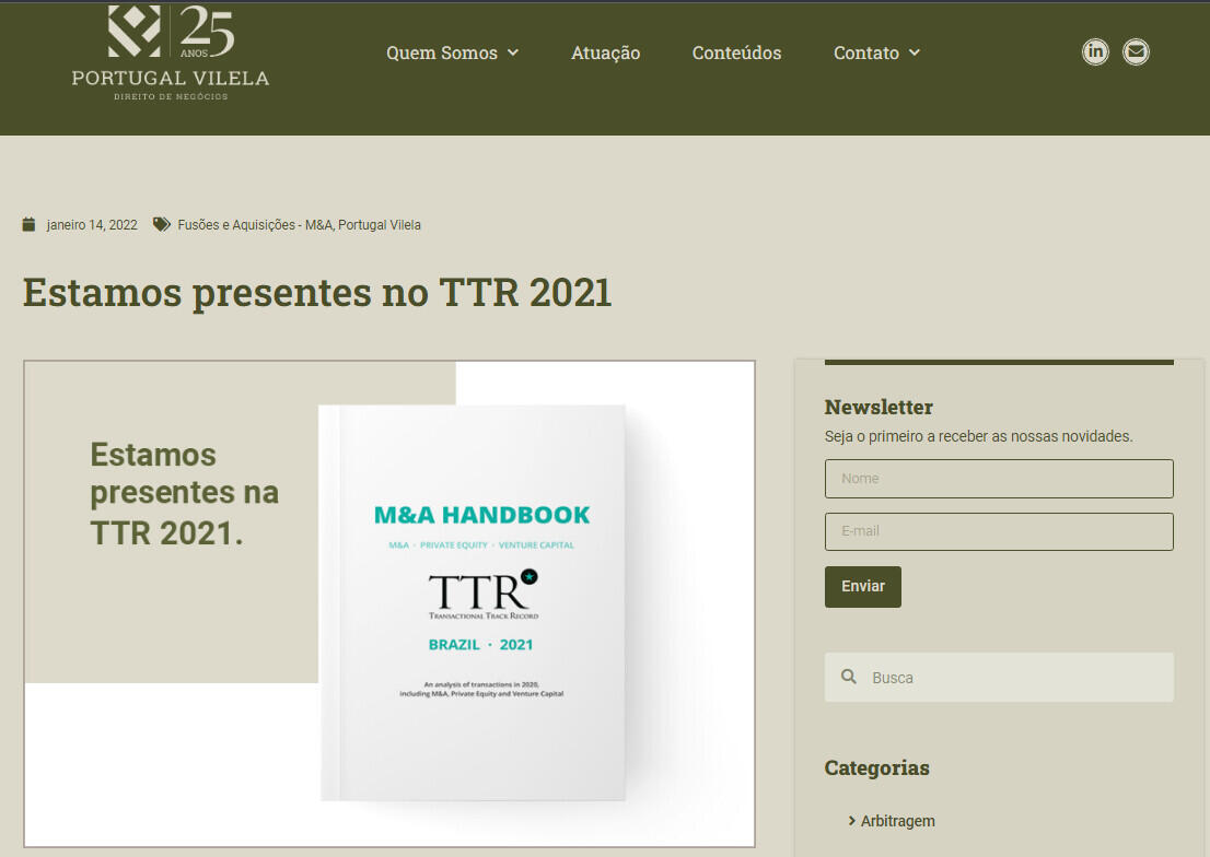 Informamos que o PORTUGAL VILELA foi indicado entre os principais escritórios especializados em operações de M&A, Venture Capital, Private Equity e Asset Acquisition, segundo o mais recente Manual de M&A TTR-Transactional Track Record 2021.