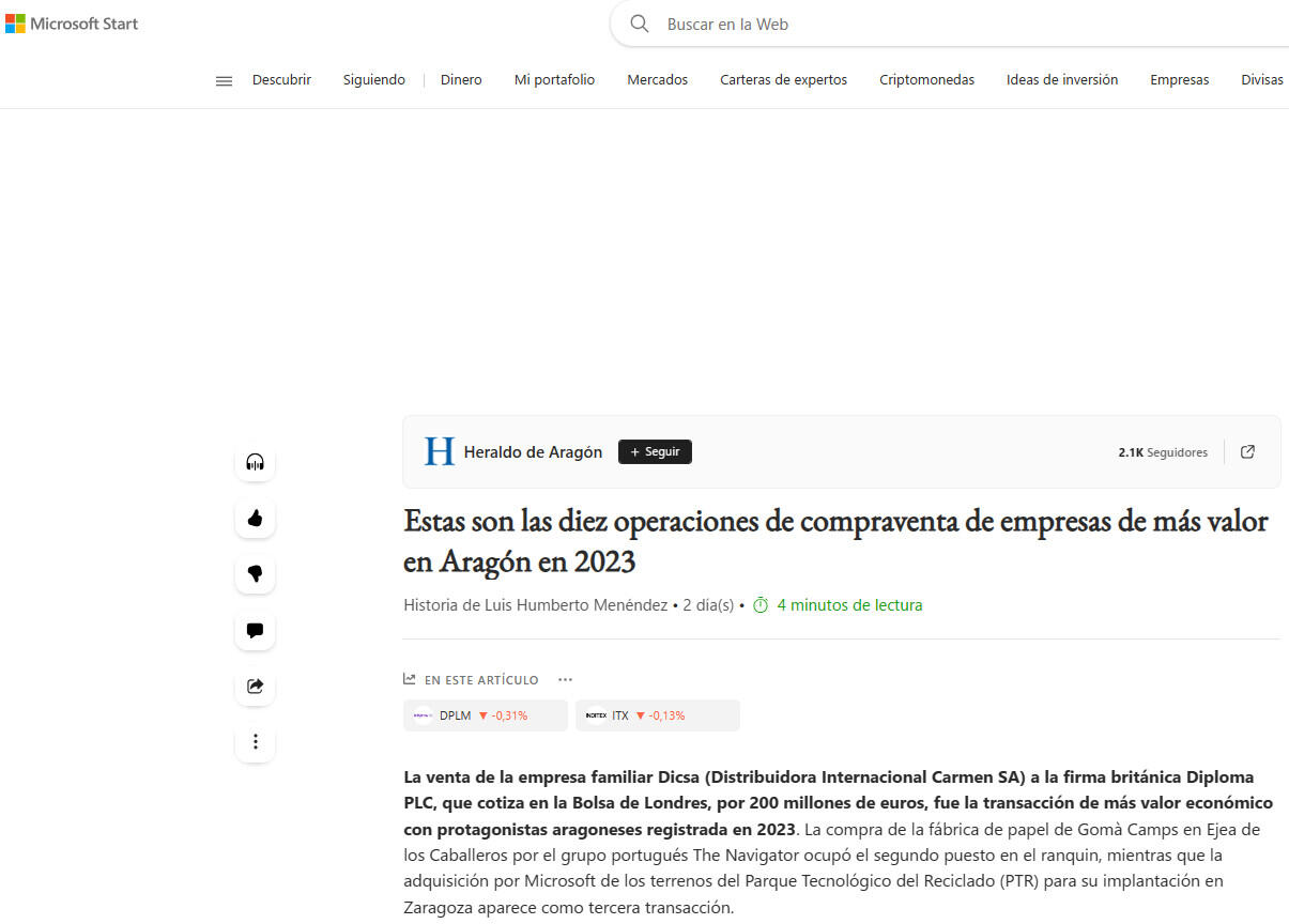 La venta de la empresa familiar Dicsa (Distribuidora Internacional Carmen SA) a la firma británica Diploma PLC, que cotiza en la Bolsa de Londres, por 200 millones de euros, fue la transacción de más valor económico con protagonistas aragoneses registrada en 2023. La compra de la fábrica de papel de Gomà Camps en Ejea de los Caballeros por el grupo portugués The Navigator ocupó el segundo puesto en el ranquin, mientras que la adquisición por Microsoft de los terrenos del Parque Tecnológico del Reciclado (PTR) para su implantación en Zaragoza aparece como tercera transacción.
