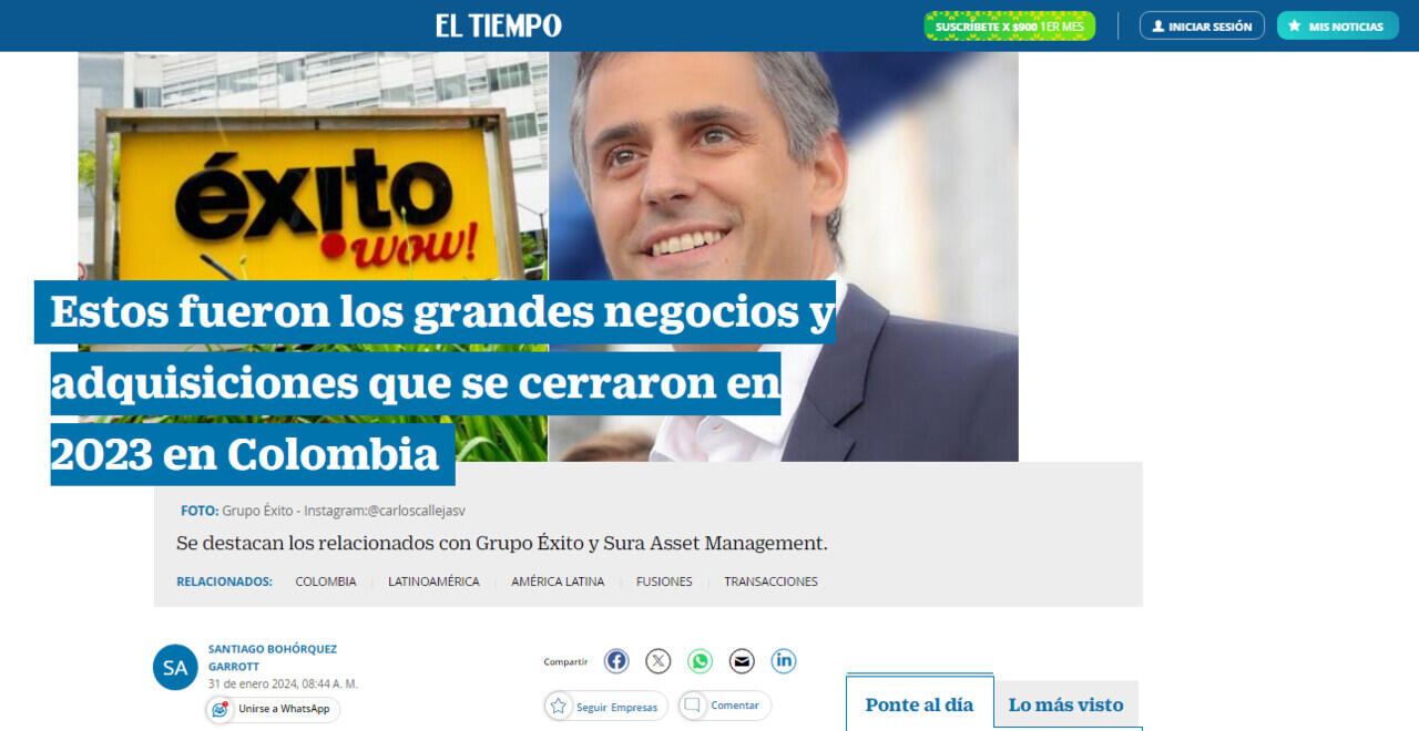 La mayor transacción del país fue la compra del Grupo Éxito por parte del Grupo Calleja de El Salvador por 1.175 millones de dólares, siendo el segundo movimiento más grande de la región.