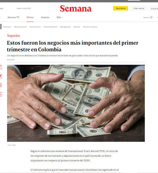 El informe explica que el mercado transaccional colombiano ha registrado en el primer trimestre de 2021 un total de 40 fusiones y adquisiciones (entre anunciadas y cerradas). Todas estas por un importe agregado de US$ 852 millones.