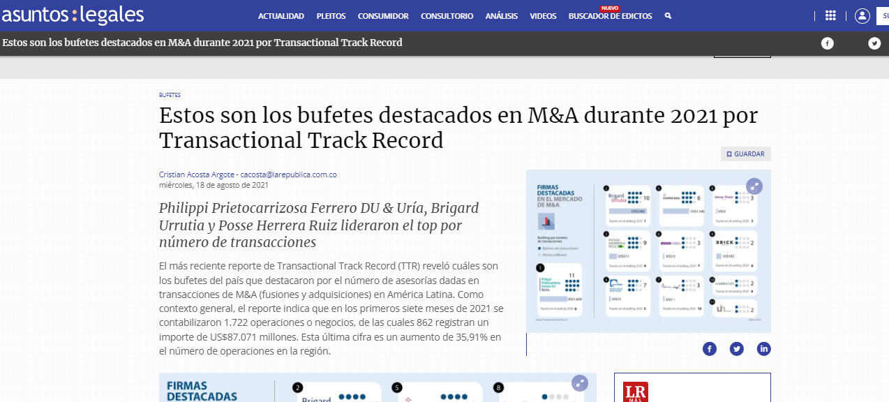 El más reciente reporte de Transactional Track Record (TTR) reveló cuáles son los bufetes del país que destacaron por el número de asesorías dadas en transacciones de M&A (fusiones y adquisiciones) en América Latina. Como contexto general, el reporte indica que en los primeros siete meses de 2021 se contabilizaron 1.722 operaciones o negocios, de las cuales 862 registran un importe de US$87.071 millones. Esta última cifra es un aumento de 35,91% en el número de operaciones en la región.