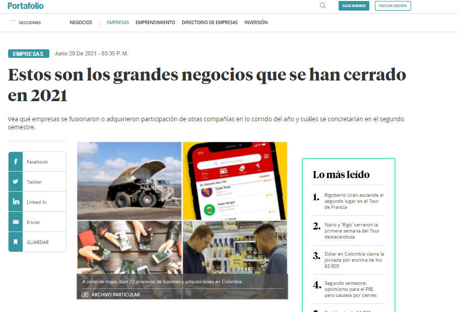En América Latina, Colombia se ubicó como el cuarto país con más transacciones y aumentó en un 11% las fusiones y adquisiciones frente al mismo periodo del año pasado.