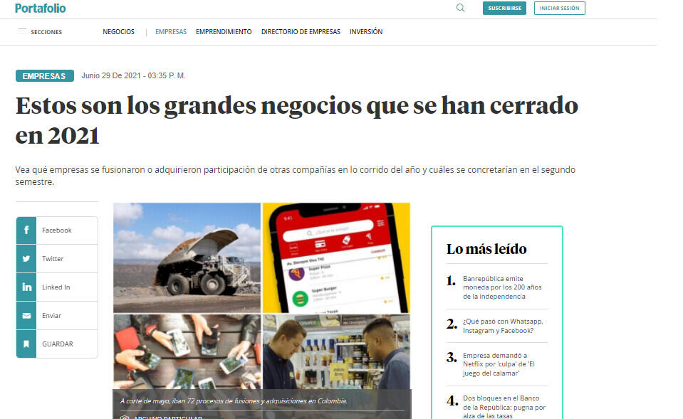 Estos negocios se suman a las 72 fusiones o adquisiciones que, según Transactional Track Record en colaboración con Datasite, se habían concretado en Colombia a corte de mayo. El capital movilizado a través de estas operaciones, según cálculos del informe, superó los US$2.778 millones.
