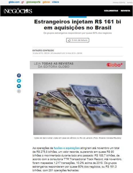 As operações de fusões e aquisições atingiram até novembro um total de R$ 275,8 bilhões, um valor recorde, superando em quase R$ 90 bilhões o movimentado durante todo ano passado: R$ 188,7 bilhões, de acordo com a consultoria TTR Transactional Track Record. Até novembro, foram mapeadas 1.217 transações, 10,2% acima de 2018. Os grupos estrangeiros responderam por quase 60% dos negócios, ou R$ 161,3 bilhões, com 281 operações fechadas.