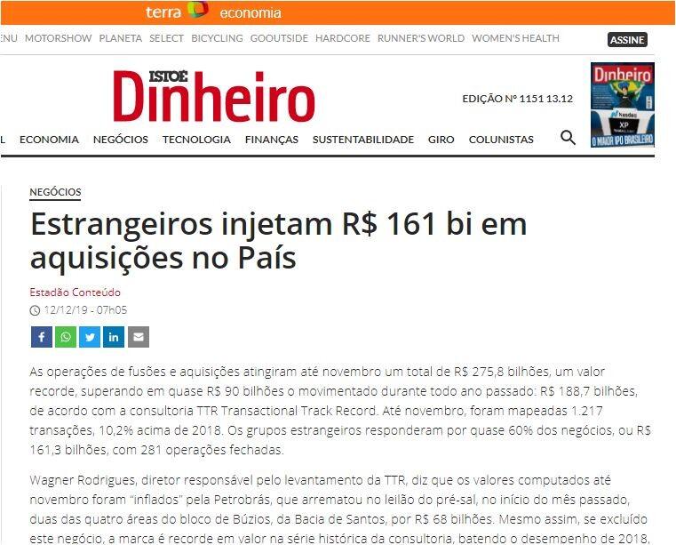 As operações de fusões e aquisições atingiram até novembro um total de R$ 275,8 bilhões, um valor recorde, superando em quase R$ 90 bilhões o movimentado durante todo ano passado: R$ 188,7 bilhões, de acordo com a consultoria TTR Transactional Track Record. Até novembro, foram mapeadas 1.217 transações, 10,2% acima de 2018. Os grupos estrangeiros responderam por quase 60% dos negócios, ou R$ 161,3 bilhões, com 281 operações fechadas.