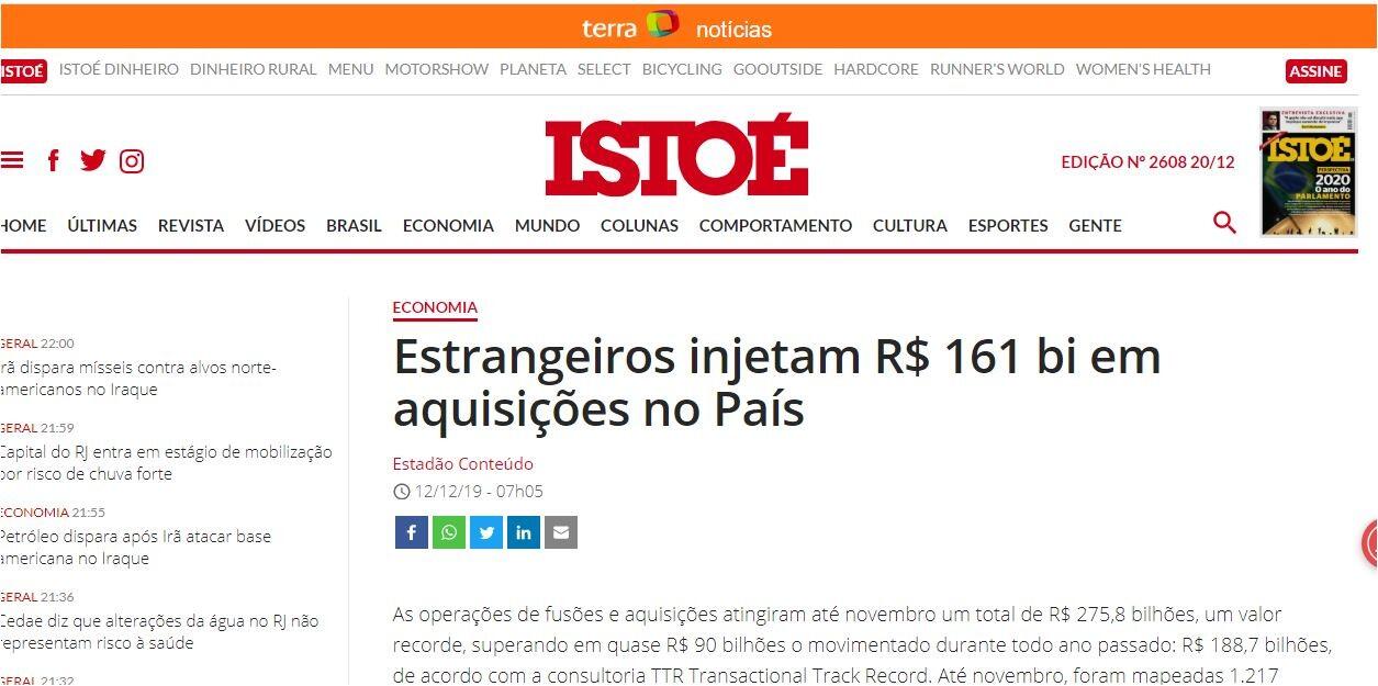 As operações de fusões e aquisições atingiram até novembro um total de R$ 275,8 bilhões, um valor recorde, superando em quase R$ 90 bilhões o movimentado durante todo ano passado: R$ 188,7 bilhões, de acordo com a consultoria TTR Transactional Track Record. Até novembro, foram mapeadas 1.217 transações, 10,2% acima de 2018. Os grupos estrangeiros responderam por quase 60% dos negócios, ou R$ 161,3 bilhões, com 281 operações fechadas.