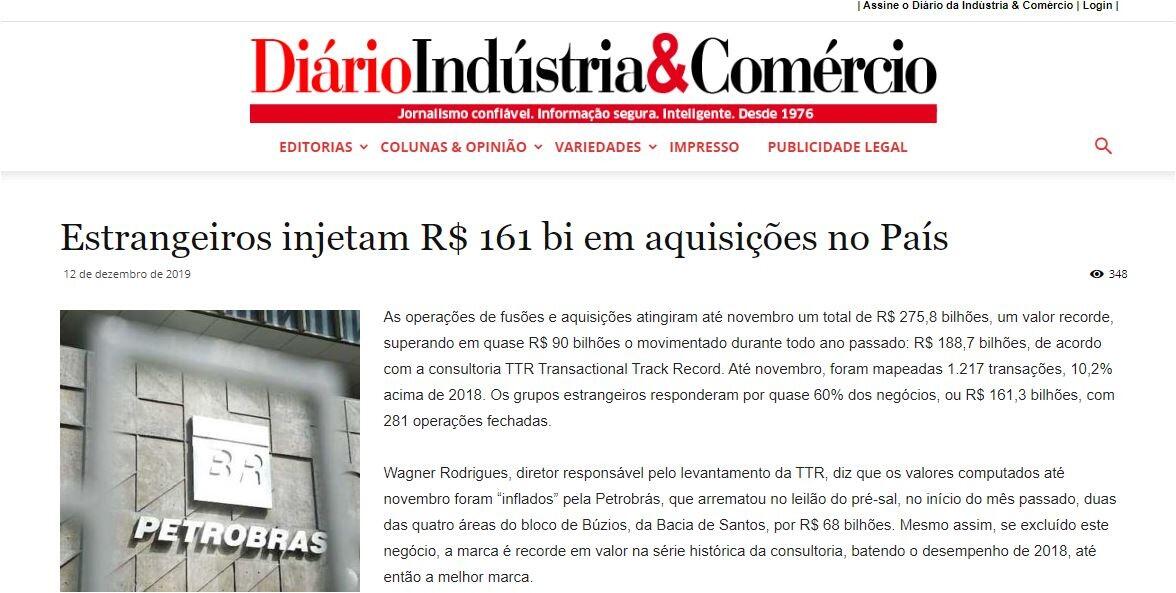 Wagner Rodrigues, diretor responsável pelo levantamento da TTR, diz que os valores computados até novembro foram “inflados” pela Petrobrás, que arrematou no leilão do pré-sal, no início do mês passado, duas das quatro áreas do bloco de Búzios, da Bacia de Santos, por R$ 68 bilhões. Mesmo assim, se excluído este negócio, a marca é recorde em valor na série histórica da consultoria, batendo o desempenho de 2018, até então a melhor marca.