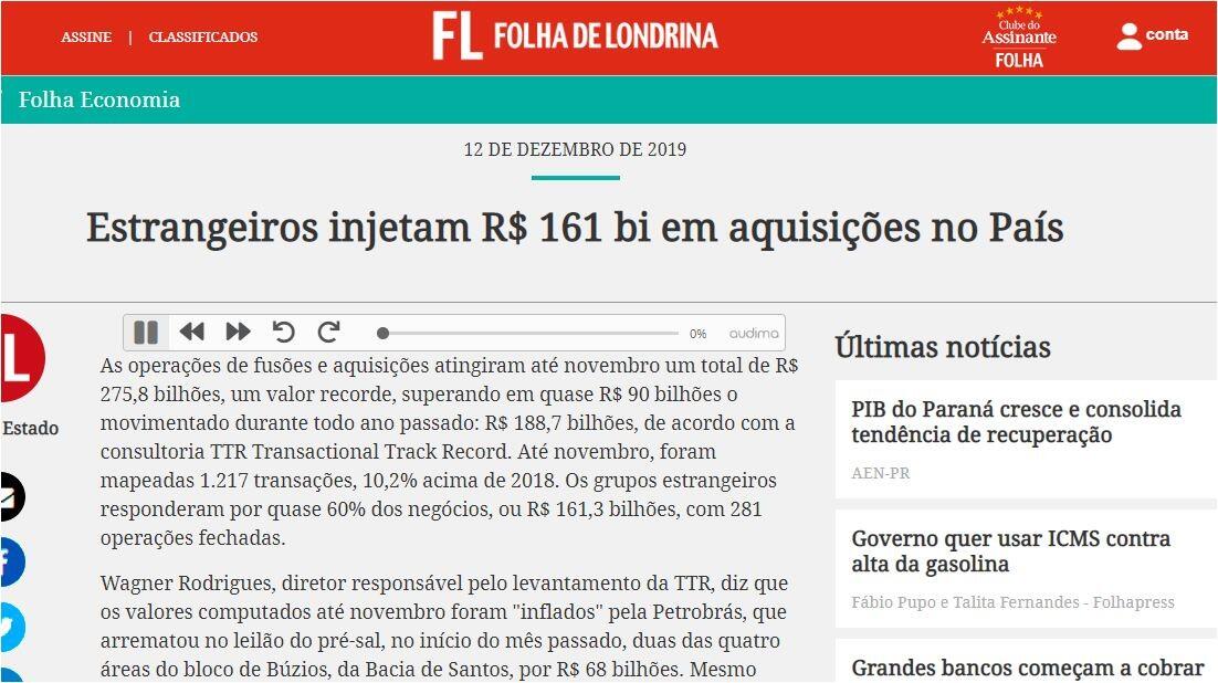 As operações de fusões e aquisições atingiram até novembro um total de R$ 275,8 bilhões, um valor recorde, superando em quase R$ 90 bilhões o movimentado durante todo ano passado: R$ 188,7 bilhões, de acordo com a consultoria TTR Transactional Track Record. Até novembro, foram mapeadas 1.217 transações, 10,2% acima de 2018. Os grupos estrangeiros responderam por quase 60% dos negócios, ou R$ 161,3 bilhões, com 281 operações fechadas.