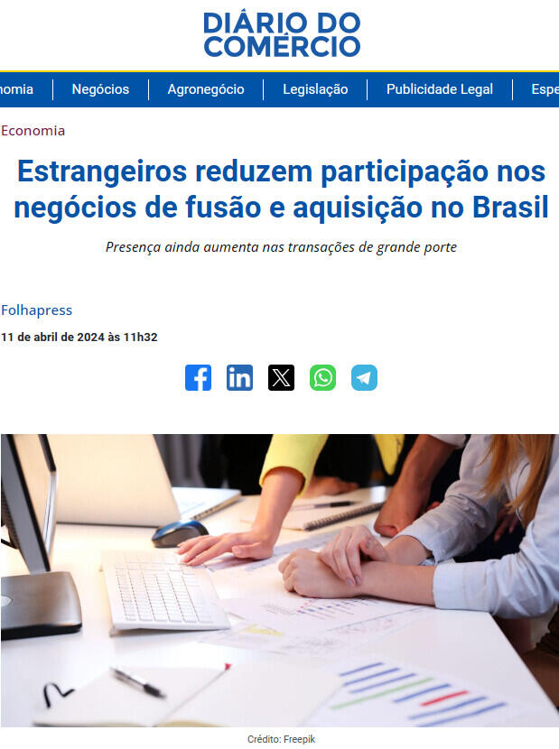 Segundo esse levantamento, de 2013 a 2023, o Brasil atingiu máxima na participação de estrangeiros em M&As (fusões e aquisições, na sigla em inglês) com valor acima de R$ 50 milhões.