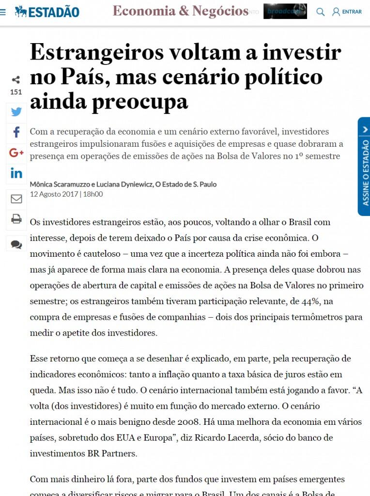Os investidores estrangeiros estão, aos poucos, voltando a olhar o Brasil com interesse, depois de terem deixado o País por causa da crise econômica. O movimento é cauteloso – uma vez que a incerteza política ainda não foi embora – mas já aparece de forma mais clara na economia. A presença deles quase dobrou nas operações de abertura de capital e emissões de ações na Bolsa de Valores no primeiro semestre; os estrangeiros também tiveram participação relevante, de 44%, na compra de empresas e fusões de companhias – dois dos principais termômetros para medir o apetite dos investidores.