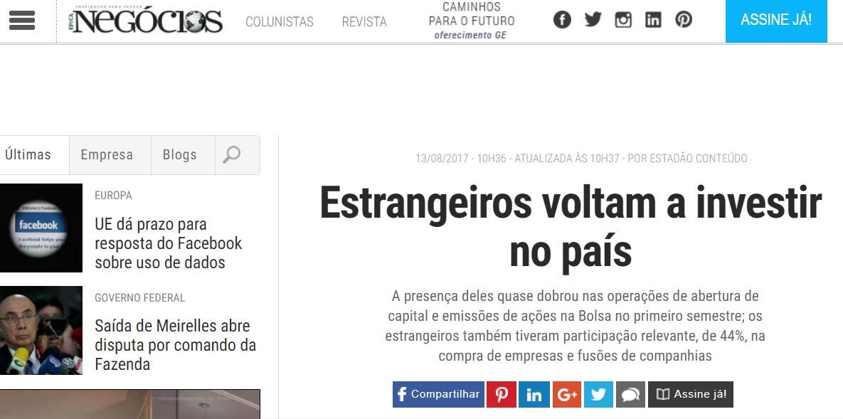 Apesar de grande parte dos papéis emitidos ter sido negociada pelo preço mínimo, houve um incremento considerável nas operações: de 2014 a 2016, a média havia sido de uma abertura de capital e quase cinco emissões de ações por ano. Além de ajudarem a aquecer o mercado, os estrangeiros elevaram suas participações. Das ações emitidas no primeiro semestre, 60,8% estão nas mãos de investidores de fora. No mesmo período de 2016, essa participação era de 35,7%, segundo a Associação Brasileira das Entidades dos Mercados Financeiro e de Capitais (Anbima).