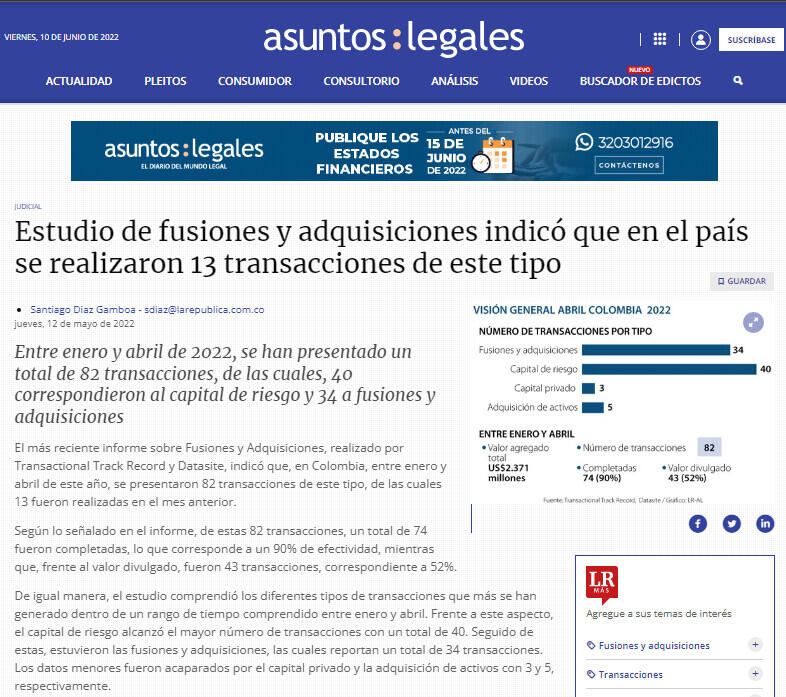El más reciente informe sobre Fusiones y Adquisiciones, realizado por Transactional Track Record y Datasite, indicó que, en Colombia, entre enero y abril de este año, se presentaron 82 transacciones de este tipo, de las cuales 13 fueron realizadas en el mes anterior.