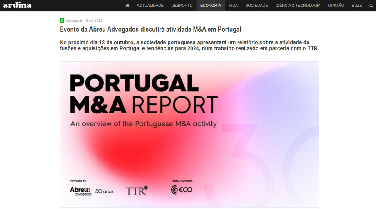 No próximo dia 18 de outubro, a sociedade portuguesa apresentará um relatório sobre a atividade de fusões e aquisições em Portugal e tendências para 2024, num trabalho realizado em parceria com o TTR.