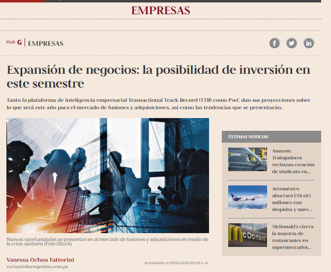 Para hacer un análisis al respecto tanto Transactional Track Record (TTR) como PwC han dado su visión de lo que se viene en los siguientes meses. Así, en base al radar de la plataforma de inteligencia empresarial de TTR, serían las expansiones de negocios las que marcarían, al menos, los primeros seis meses del año, en medio de un contexto de segunda ola del Covid-19 y de un proceso electoral.