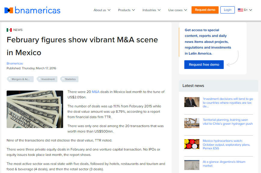 There were 20 M&A deals in Mexico last month to the tune of US$2.05bn.