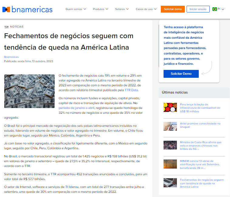 O fechamento de negócios caiu 19% em volume e 29% em valor agregado na América Latina no terceiro trimestre de 2023 em comparação com o mesmo período de 2022, de acordo com relatório trimestral publicado pela TTR Data.