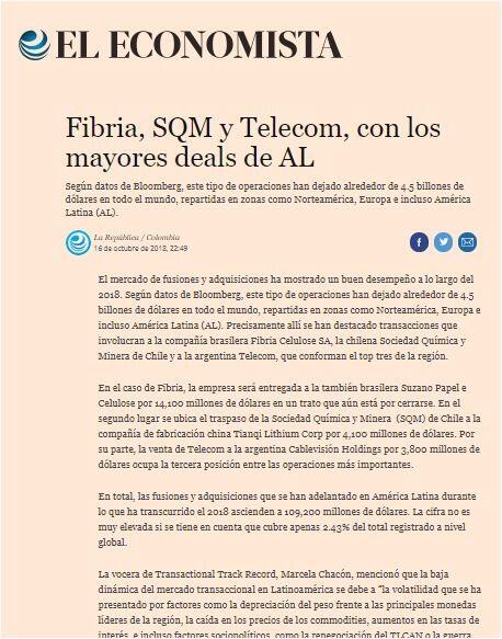 Fibria, SQM y Telecom, con los mayores deals de AL
