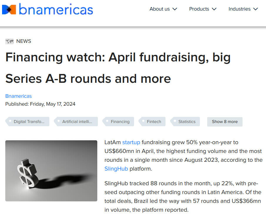 LatAm startup fundraising grew 50% year-on-year to US$660mn in April, the highest funding volume and the most rounds in a single month since August 2023, according to the SlingHub platform.