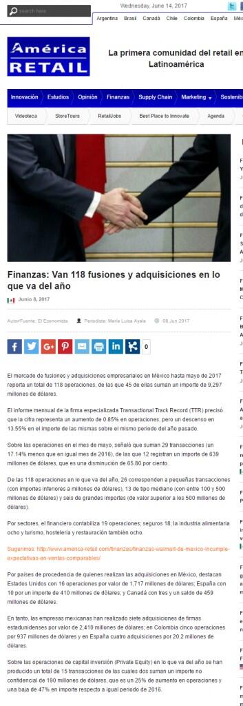 El mercado de fusiones y adquisiciones empresariales en México hasta mayo de 2017 reporta un total de 118 operaciones, de las que 45 de ellas suman un importe de 9,297 millones de dólares.