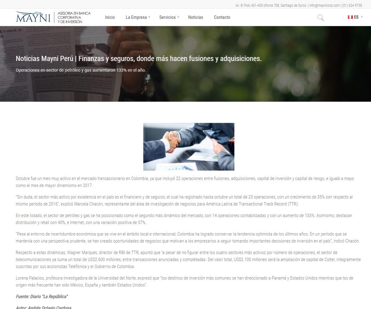 “Sin duda, el sector más activo por excelencia en el país es el financiero y de seguros, el cual ha registrado hasta octubre un total de 23 operaciones, con un crecimiento de 35% con respecto al mismo período de 2016”, explicó Marcela Chacón, representante del área de investigación de negocios para América Latina de Transactional Track Record (TTR).