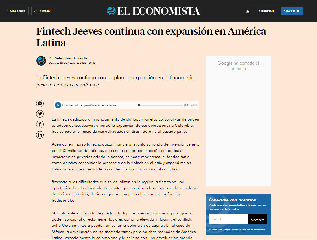 La fintech dedicada al financiamiento de startups y tarjetas corporativas de origen estadounidense, Jeeves, anunció la expansión de sus operaciones a Colombia, tras concretar el inicio de sus actividades en Brasil durante el pasado junio.
