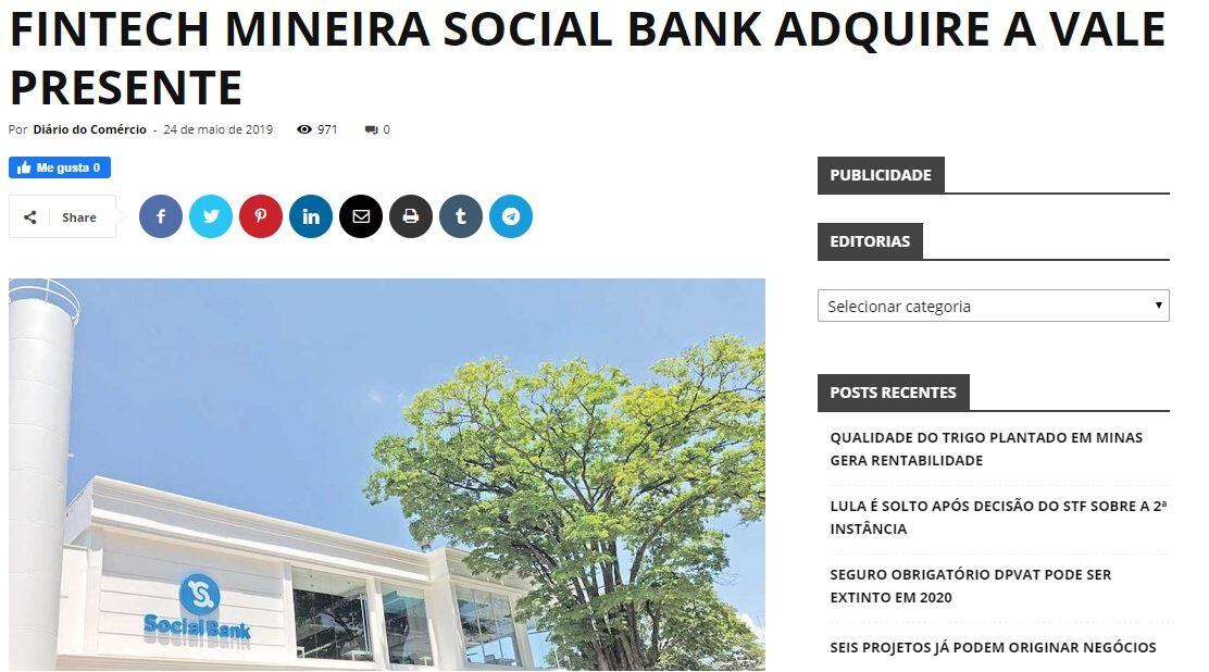 O Social Bank, fintech com sede em Uberlândia, no Triângulo Mineiro, empresa que permite que as pessoas realizem qualquer tipo de transação entre si a partir de uma conta de pagamento digital, acaba de anunciar a compra da Vale Presente, maior operação de gift cards personalizados da América Latina, que pertencia à HUB Fintech.