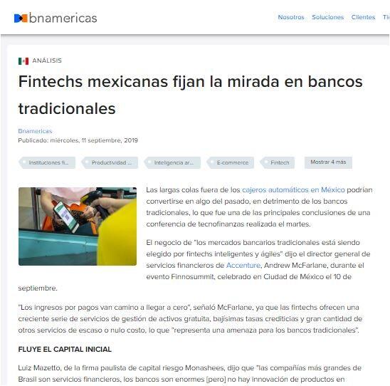 El negocio de "los mercados bancarios tradicionales está siendo elegido por fintechs inteligentes y ágiles" dijo el director general de servicios financieros de Accenture, Andrew McFarlane, durante el evento Finnosummit, celebrado en Ciudad de México el 10 de septiembre.