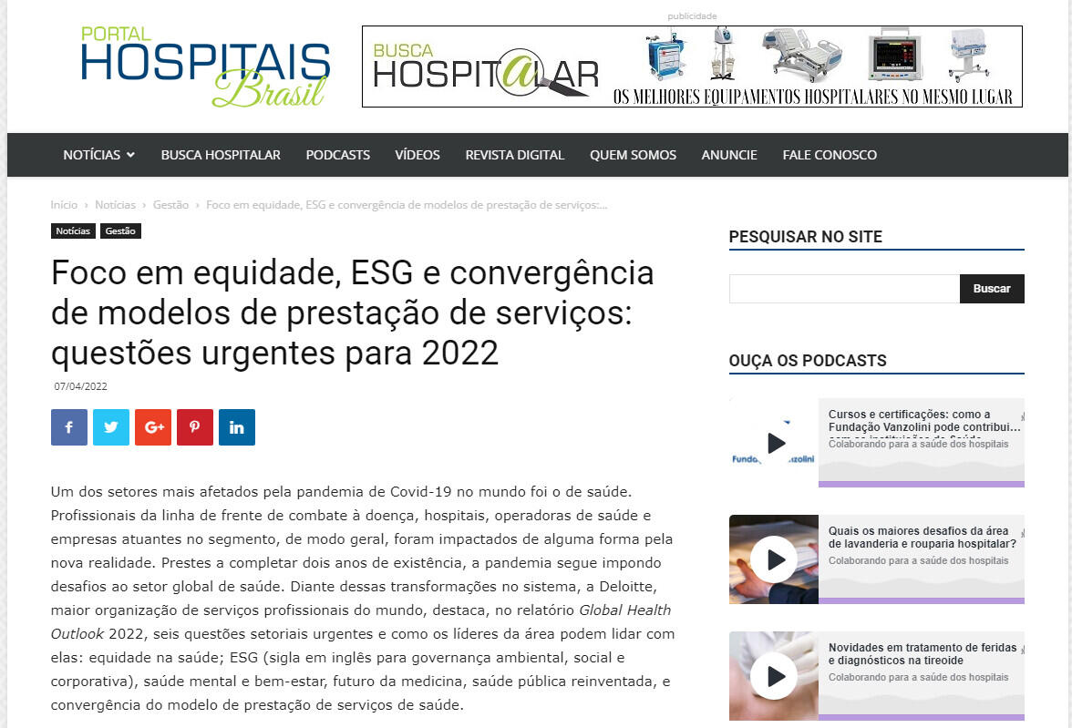 Um dos setores mais afetados pela pandemia de Covid-19 no mundo foi o de saúde. Profissionais da linha de frente de combate à doença, hospitais, operadoras de saúde e empresas atuantes no segmento, de modo geral, foram impactados de alguma forma pela nova realidade. Prestes a completar dois anos de existência, a pandemia segue impondo desafios ao setor global de saúde. Diante dessas transformações no sistema, a Deloitte, maior organização de serviços profissionais do mundo, destaca, no relatório Global Health Outlook 2022, seis questões setoriais urgentes e como os líderes da área podem lidar com elas: equidade na saúde; ESG (sigla em inglês para governança ambiental, social e corporativa), saúde mental e bem-estar, futuro da medicina, saúde pública reinventada, e convergência do modelo de prestação de serviços de saúde.