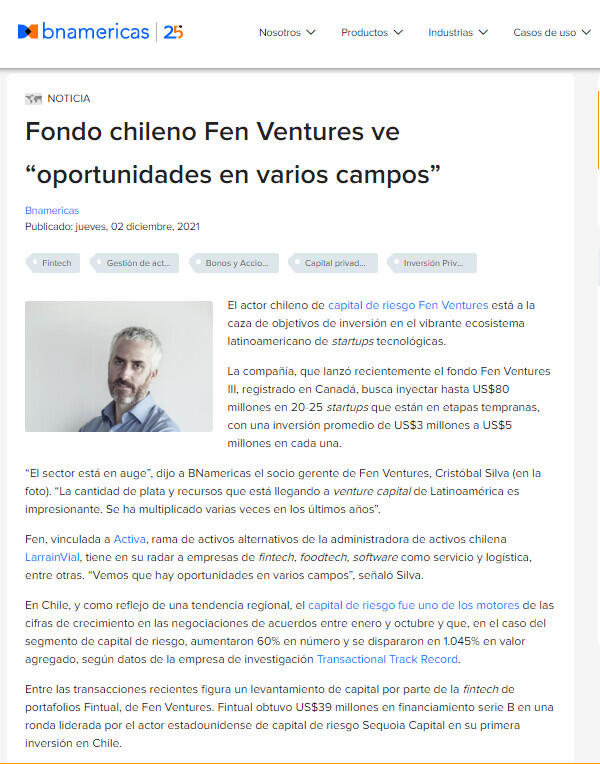 Fen, vinculada a Activa, rama de activos alternativos de la administradora de activos chilena LarrainVial, tiene en su radar a empresas de fintech, foodtech, software como servicio y logística, entre otras. “Vemos que hay oportunidades en varios campos”, señaló Silva.