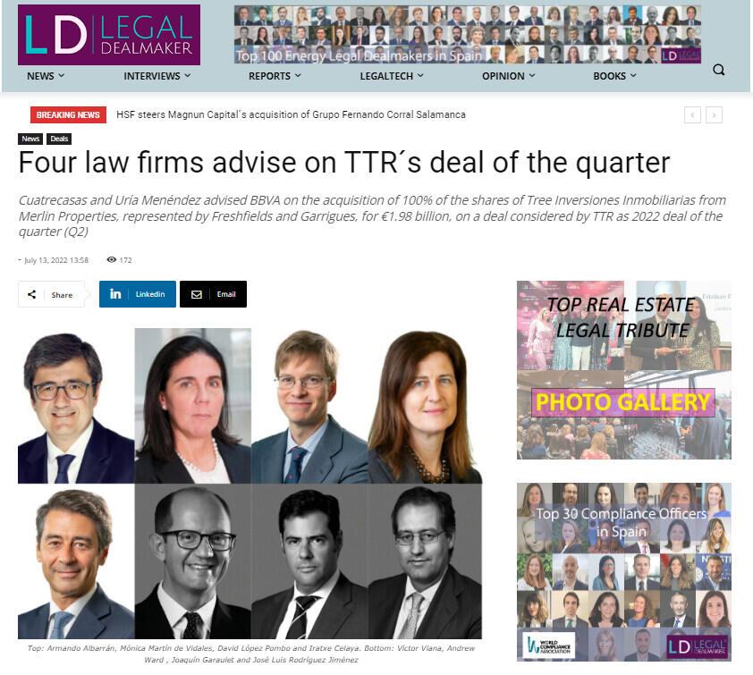 Cuatrecasas and Uría Menéndez advised BBVA on the acquisition of 100% of the shares of the of Tree Inversiones Inmobiliarias from Merlin Properties, represented by Freshfields and Garrigues, for €1.98 billion, on a deal considered by TTR as 2022 deal of the quarter (Q2)