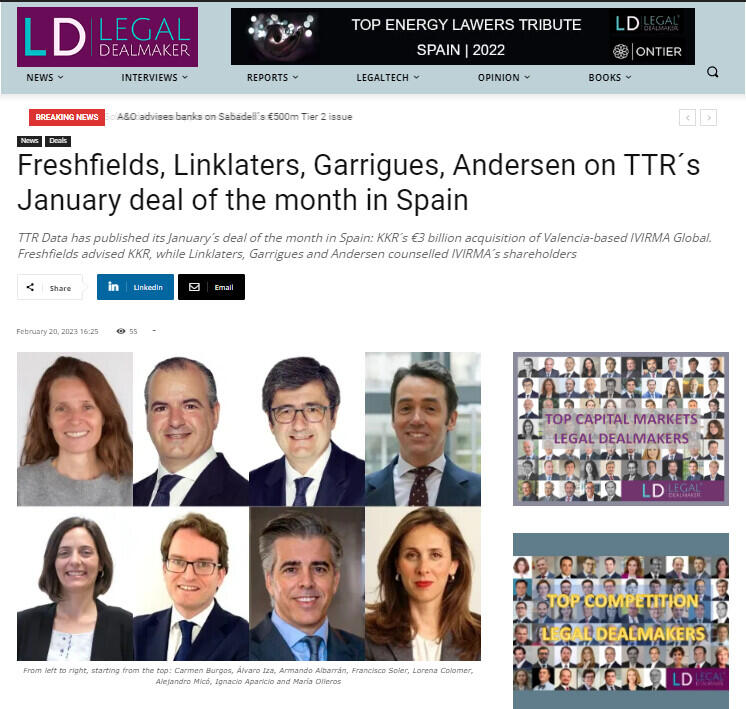 TTR Data has published its January's deal of the month in Spain: KKR's €3 billion acquisition of Valencia-based IVIRMA Global. Freshfields advised KKR, while Linklaters, Garrigues and Andersen counselled IVIRMA's shareholders