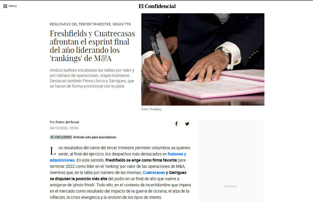 Los resultados del cierre del trimestre permiten vislumbrar ya quiénes serán, al final del ejercicio, los despachos más destacados en fusiones y adquisiciones. En este sentido, Freshfields se erige como firma favorita para terminar 2022 como líder en el 'ranking' por valor de las operaciones de M&A, mientras que, en la tabla por número de las mismas, Cuatrecasas y Garrigues se disputan la posición más alta del podio en un final de año que vuelve a antojarse de 'photo finish'. Todo ello, en el contexto de incertidumbre que impera en el mercado como resultado del impacto de la guerra de Ucranía, el alza de la inflación, la crisis energética y la revisión de los tipos de interés.