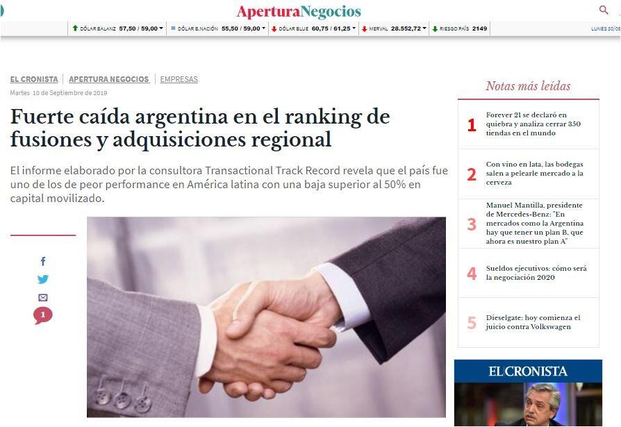 Fuerte caída argentina en el ranking de fusiones y adquisiciones