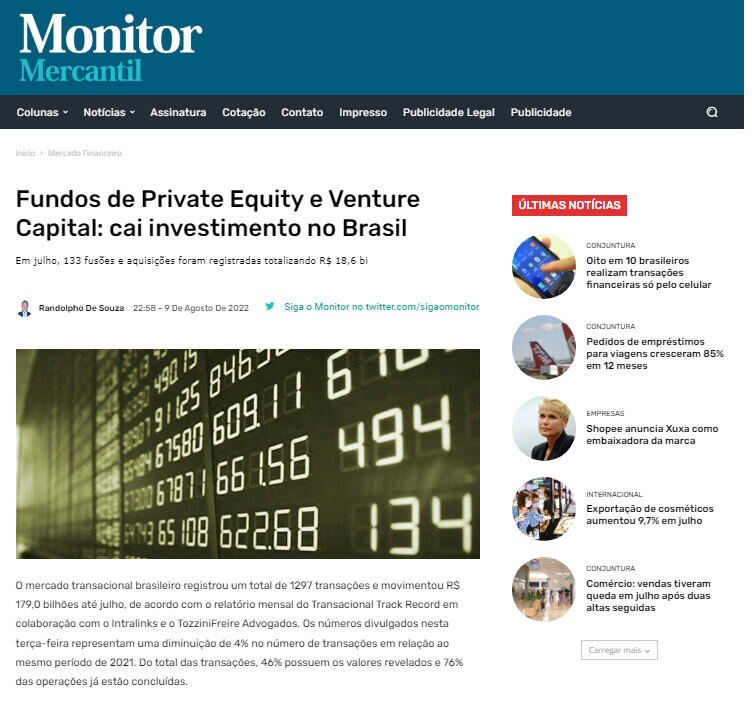 O mercado transacional brasileiro registrou um total de 1297 transações e movimentou R$ 179,0 bilhões até julho, de acordo com o relatório mensal do Transacional Track Record em colaboração com o Intralinks e o TozziniFreire Advogados. Os números divulgados nesta terça-feira representam uma diminuição de 4% no número de transações em relação ao mesmo período de 2021. Do total das transações, 46% possuem os valores revelados e 76% das operações já estão concluídas.
