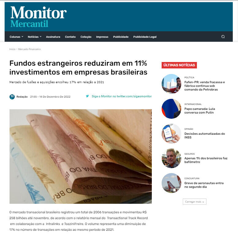 O mercado transacional brasileiro registrou um total de 2006 transações e movimentou R$ 258 bilhões até novembro, de acordo com o relatório mensal do Transactional Track Record em colaboração com a Intralinks e TozziniFreire. O volume representa uma diminuição de 17% no número de transações em relação ao mesmo período de 2021.