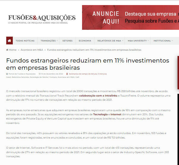 O mercado transacional brasileiro registrou um total de 2006 transações e movimentou R$ 258 bilhões até novembro, de acordo com o relatório mensal do Transactional Track Record em colaboração com a Intralinks e TozziniFreire. O volume representa uma diminuição de 17% no número de transações em relação ao mesmo período de 2021.
