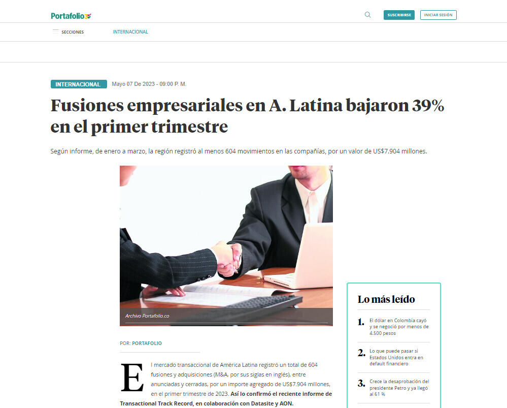 El mercado transaccional de América Latina registró un total de 604 fusiones y adquisiciones (M&A, por sus siglas en inglés), entre anunciadas y cerradas, por un importe agregado de US$7.904 millones, en el primer trimestre de 2023. Así lo confirmó el reciente informe de Transactional Track Record, en colaboración con Datasite y AON.
