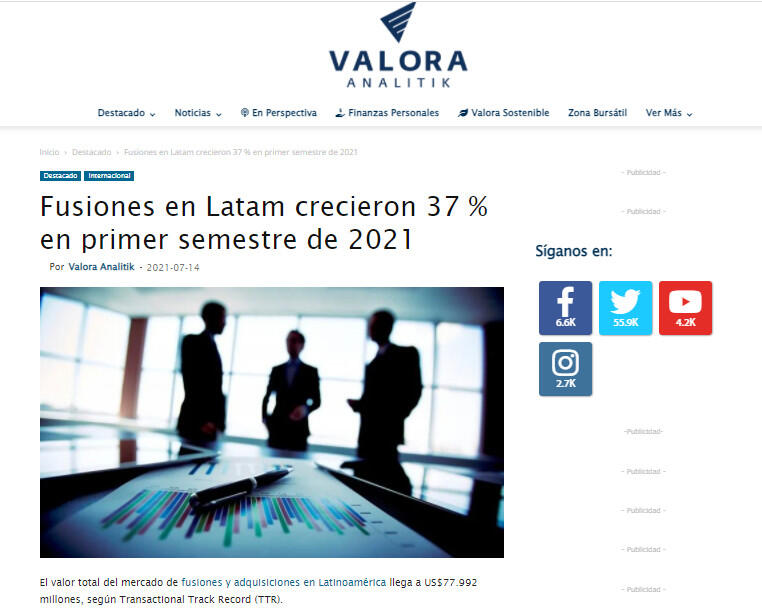 El mercado transaccional de América Latina ha registrado en el primer semestre de 2021 un total de 1.376 fusiones y adquisiciones, entre anunciadas y cerradas, por un importe agregado de US$ 77.992 millones, según el más reciente informe trimestral de Transactional Track Record (www.ttrecord.com) en Colaboración con Datasite. Vea más en Internacional.