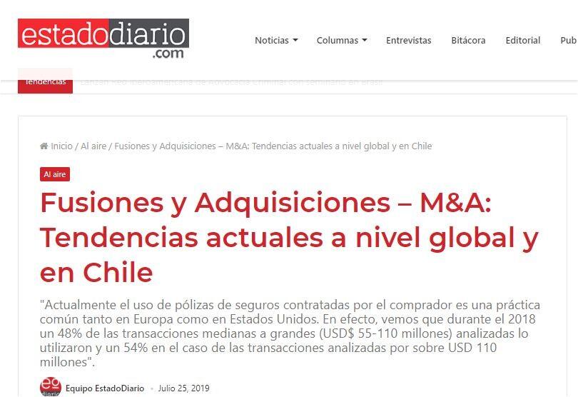 "Actualmente el uso de pólizas de seguros contratadas por el comprador es una práctica común tanto en Europa como en Estados Unidos. En efecto, vemos que durante el 2018 un 48% de las transacciones medianas a grandes (USD$ 55-110 millones) analizadas lo utilizaron y un 54% en el caso de las transacciones analizadas por sobre USD 110 millones".