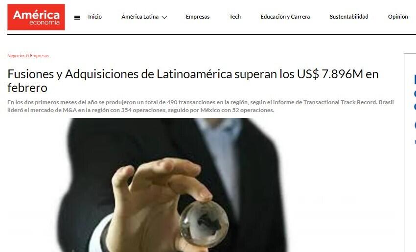 En los dos primeros meses del año se produjeron un total de 490 transacciones en la región, según el informe de Transactional Track Record. Brasil lideró el mercado de M&A en la región con 354 operaciones, seguido por México con 52 operaciones.