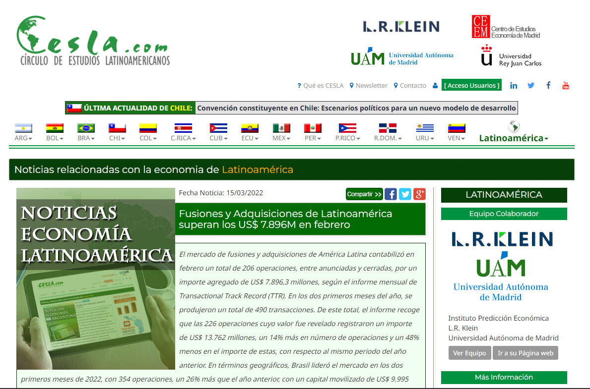 El mercado de fusiones y adquisiciones de América Latina contabilizó en febrero un total de 206 operaciones, entre anunciadas y cerradas, por un importe agregado de US$ 7.896,3 millones, según el informe mensual de Transactional Track Record (TTR). En los dos primeros meses del año, se produjeron un total de 490 transacciones. De este total, el informe recoge que las 226 operaciones cuyo valor fue revelado registraron un importe de US$ 13.762 millones, un 14% más en número de operaciones y un 48% menos en el importe de estas, con respecto al mismo periodo del año anterior. En términos geográficos, Brasil lideró el mercado en los dos primeros meses de 2022, con 354 operaciones, un 26% más que el año anterior, con un capital movilizado de US$ 9.995 millones, un 57% menos. Al país sudamericano le siguió México, con 52 operaciones (+13%) y un valor de US$ 1.554 millones, casi cuatro veces más que el año anterior. Por su parte, Chile registró 38 operaciones (-21%), con un descenso del 72% en el capital movilizado, hasta US$ 768 millones. Argentina, de su lado, registró 29 transacciones, un 4% más; y un capital movilizado de US$ 629 millones, un 48% menos. Colombia registró 28 operaciones (-22%) por un valor de US$ 1.481 millones, un 49% más. De su lado, Perú contabilizó 21 operaciones (+24%) con un valor de US$ 331 millones, un 82% menos. En el ámbito cross-border el estudio destaca "el apetito inversor" de las compañías latinoamericanas en Europa y Norteamérica, donde se llevaron a cabo 17 y 14 transacciones en cada región, respectivamente. Por su parte, las compañías que más realizaron operaciones estratégicas en América Latina procedían de Norteamérica y Europa, con 90 y 62 operaciones, respectivamente. Private Equity, Venture Capital y Adquisición de Activos Por último, el análisis de TTR resalta que hasta febrero se registraron 26 operaciones de private equity por US$ 763 millones, un 21% menos en volumen de operaciones y un descenso del 80% en el importe de estas, con respecto al mismo periodo del año anterior. Por su parte, el segmento de venture capital contabilizó hasta febrero un total de 152 operaciones, con un importe agregado de US$ 2.046 millones, lo que implica una variación positiva del 9% en el número de operaciones y un aumento del 30% en el importe de las mismas en términos interanuales. En el segmento de adquisición de activos, hasta finales de febrero se registraron 45 operaciones, por un valor de US$ 2.393 millones, lo cual representa un descenso del 4% en el número de operaciones y un aumento del 21% en el importe de estas, con respecto al mismo periodo de 2021. Como transacción destacada del mes, Transactional Track Record ha seleccionado la adquisición del 12,36% de Itaú CorpBanca Colombia por su matriz, Itaú CorpBanca. La operación, valorada en US$ 414,14 millones, fue asesorada en la parte legal por Posse Herrera Ruiz, Simpson Thacher & Bartlett US, Inversiones CorpGroup Interhold, Brigard Urrutia, Wachtell, Lipton, Rosen & Katz, Baraona Marshall e Itaú CorpBanca. En lo que respecta a las perspectivas del mercado de fusiones y adquisiciones latinoamericano, Pablo Iacobelli, socio de Carey, ha explicado que donde se puede producir un boom es en la adquisición de compañías de generación de energía que no utilicen el petróleo como su principal materia prima. Iacobelli ha incidido en que estas empresas podrán ser aún más competitivas en términos de precio, considerando el repunte en los precios del crudo, por lo que las empresas de generación de energía más verdes "pueden atraer más ojos de inversionistas".
