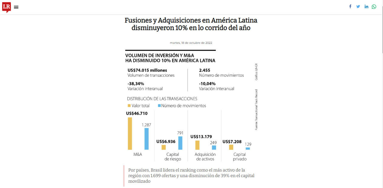 Por su parte, las 143 transacciones ocurridas en Argentina representan un descenso de 4% y una disminución de 4% en su importe (US$3.795 millones), respecto del mismo periodo del año pasado. Perú, por su parte, ha registrado 83 transacciones y una disminución de 37% en su capital movilizado.