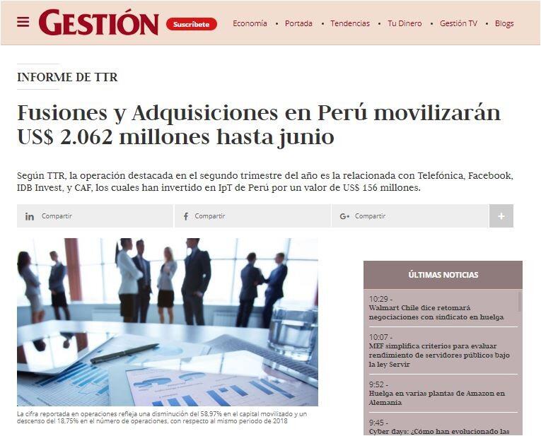 Según TTR, la operación destacada en el segundo trimestre del año es la relacionada con Telefónica, Facebook, IDB Invest, y CAF, los cuales han invertido en IpT de Perú. El valor de la operación fue de US$ 156 millones y estuvo asesorada por la parte legal por Garrigues Perú, Clifford Chance, DLA Piper Pizarro Botto Escobar, Estudio Echecopar y Rebaza, Alcázar & De Las Casas. Por la parte financiera, la transacción ha sido asesorada por Macroinvest - Grupo Macro.