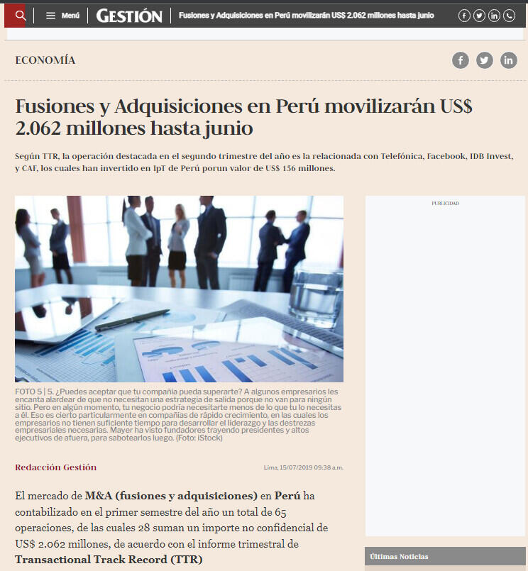 El mercado de M&A (fusiones y adquisiciones) en Perú ha contabilizado en el primer semestre del año un total de 65 operaciones, de las cuales 28 suman un importe no confidencial de US$ 2.062 millones, de acuerdo con el informe trimestral de Transactional Track Record (TTR)