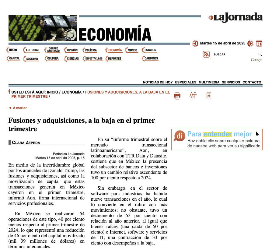 En su “Informe trimestral sobre el mercado transaccional latinoamericano”, Aon, en colaboración con TTR Data y Datasite, sostiene que en México la presencia del subsector de bancos e inversiones tuvo un cambio relativo ascendente de 100 por ciento respecto a 2024.