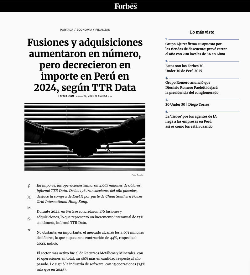 Fusiones y adquisiciones aumentaron en número, pero decrecieron en importe en Perú en 2024, según TTR Data