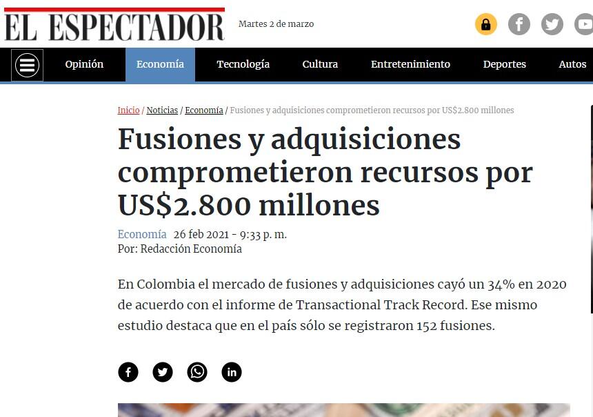 En Colombia, el mercado de fusiones y adquisiciones cayó un 34% en 2020 de acuerdo con el informe de Transactional Track Record. El mismo estudio mostró que en el país sólo se registraron 152 fusiones.
