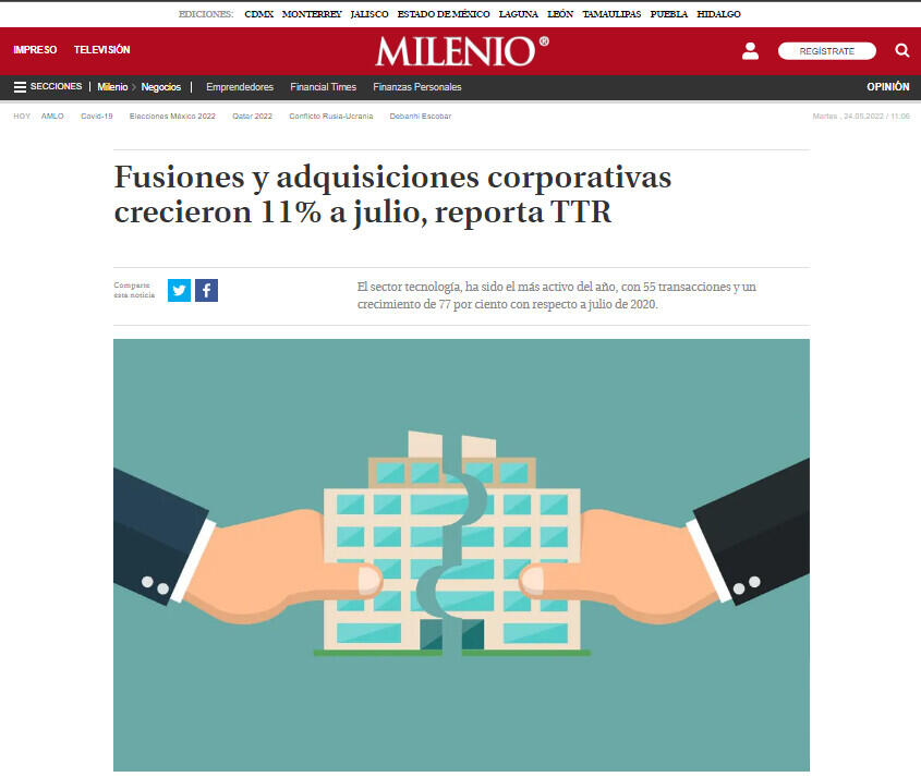 Fusiones y adquisiciones corporativas crecieron 11% a julio, reporta TTR